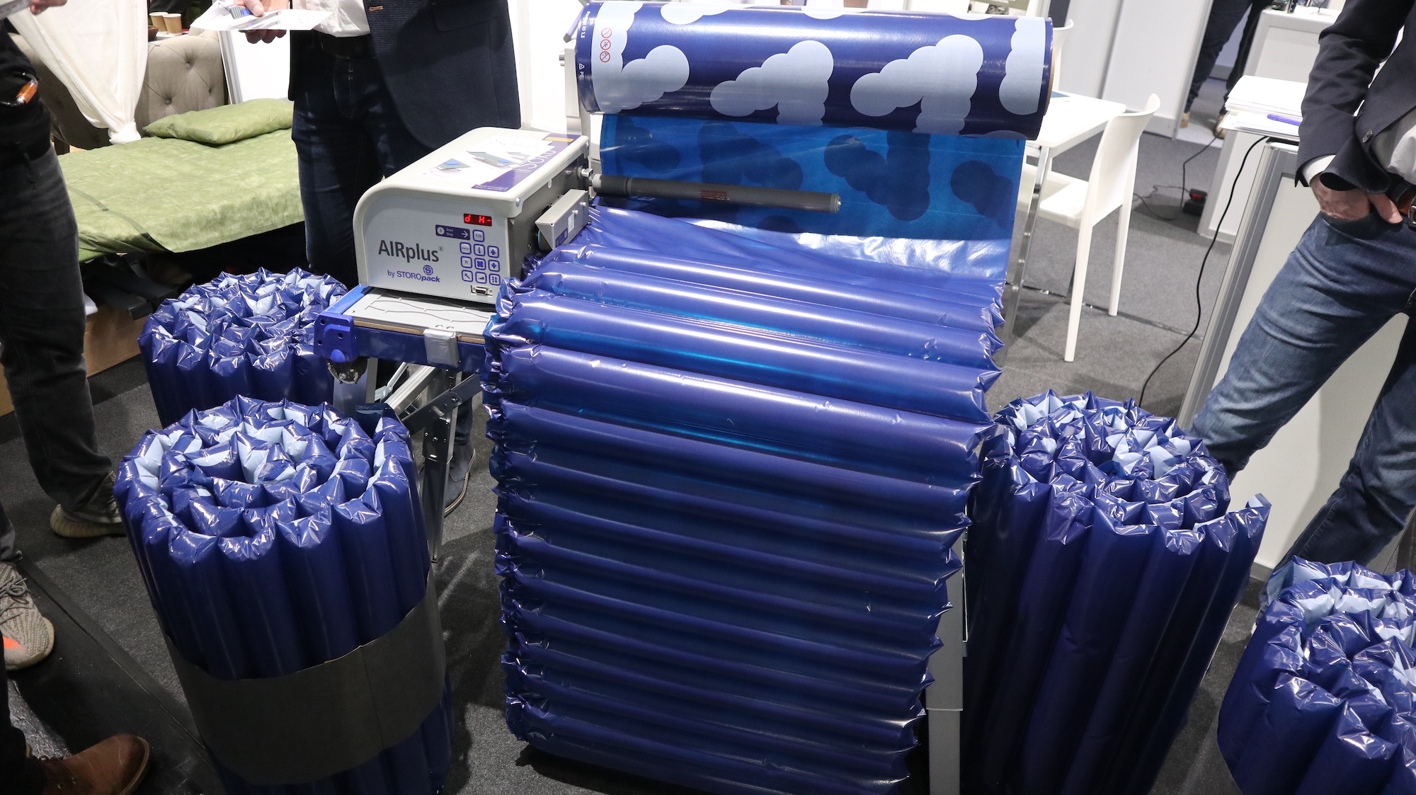 Eine Minute dauert der Aufbau der Maschine. Lediglich 20 Sekunden dauert das Befüllen aller 29 Kammern, die Schnittkante zwischen den einzelnen Matratzen ist perforiert, sodass die Luftmatratzen durch schlichtes Abreißen voneinander getrennt werden können.