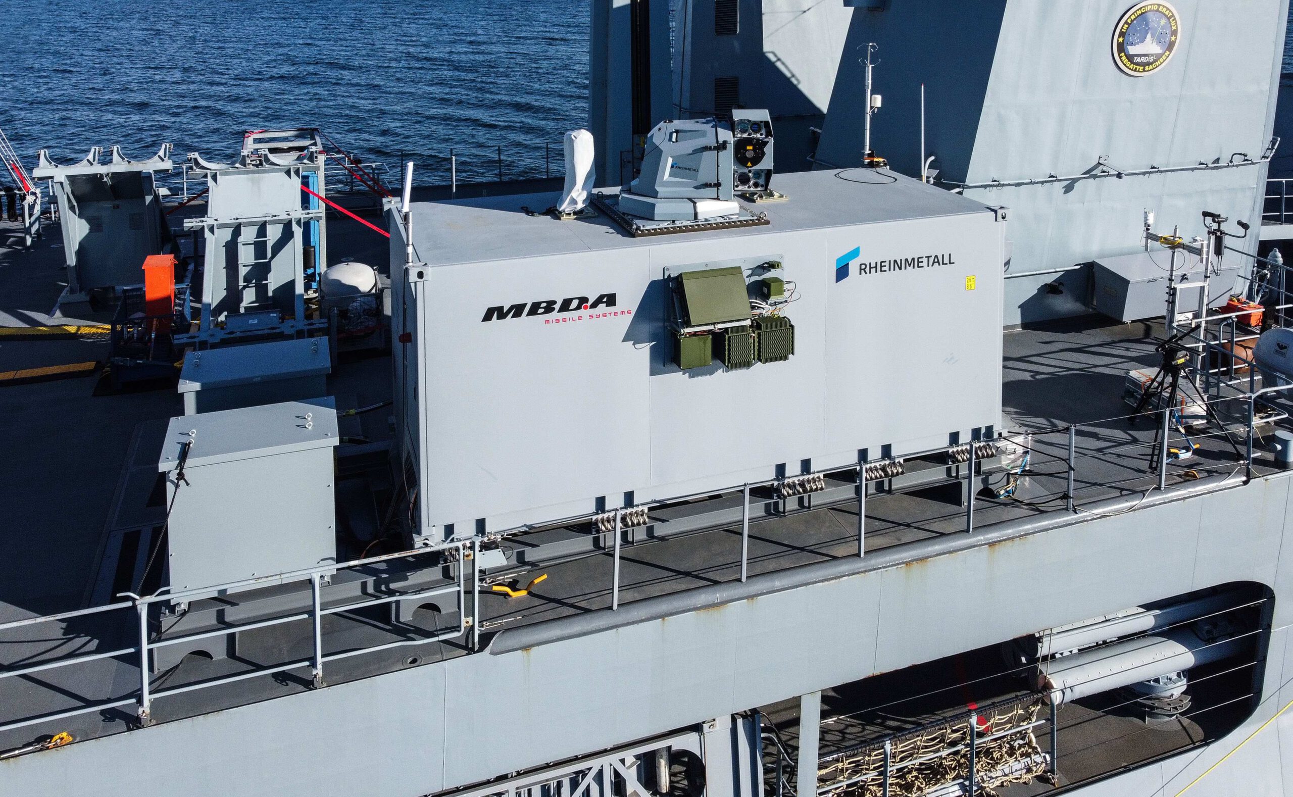 „Je nachdem wie die operationellen Anforderungen auch mit Blick auf die zeitlichen Rahmenbedingungen und die in Betracht gezogenen Plattformen aussehen, kommen sowohl Flugkörper als auch Lasertechnologie infrage“, meint Zimper. Laser wirken auf Ziele in Lichtgeschwindigkeit, mit hoher Präzision und geringstmöglichem Kollateralschaden. Es ist eine völlig neue Generation von Verteidigungssystemen. Gemeinsam mit Rheinmetall arbeitet MBDA Deutschland an der Entwicklung eines Hochenergie-Lasersystems, bildete 2021 eine Arbeitsgemeinschaft, um zunächst schiffsgestützt einen Laserwaffendemonstrator zu entwickeln und diesen auf der Fregatte SACHSEN, einer zur Verbandsluftabwehr befähigten Fregatte der Klasse 124, zu integrieren. MBDA Deutschland ist für das Tracking, die Bedienkonsole und Anbindung des Laserwaffendemonstrators an das Führungssystem zuständig. Im Verantwortungsbereich Rheinmetalls liegen die Laserwaffenstation, das Strahlführungssystem sowie Kühlung und Integration des Laserwaffendemon- strators in den Projektcontainer des Laserquellendemonstrators.