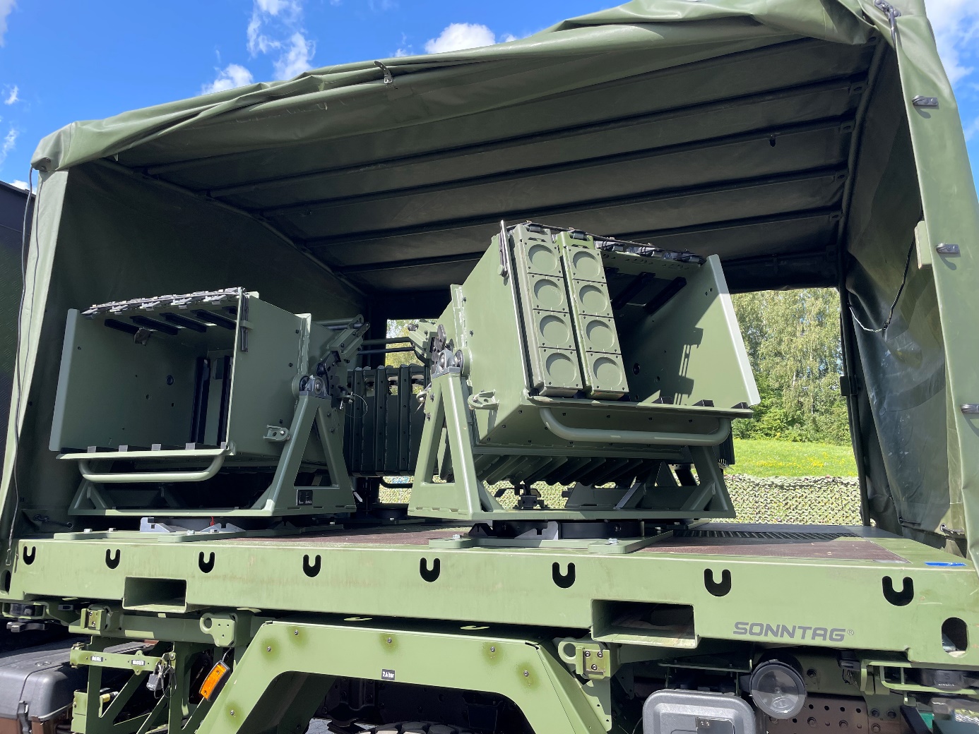Anlässlich der DALO Industry Days 2024 in Dänemark wurde dieser Containerrahmen auf einem IVECO-Eurocargo 150-280 UTV 4×4 gl transportiert. Dieses Fahrzeug in der Größe des UNIMOGS von Mercedes-Benz nimmt die 10-Fuß ISO668-Plattform mit vier Werferstationen auf und kann so in einem Zug bis zu 400 AT2+ ausbringen. Dank der AT2+ Magazine ist auch eine schnelle Nachbestückung sichergestellt. DND stellt diese Lösung in Kooperation mit den Partnern KNDS Deutschland und SONNTAG vor.