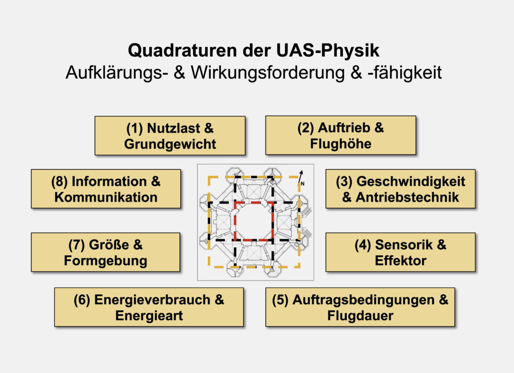Die Physik stellt für die Intrusionsfähigkeit eines UAS natürliche Herausforderungen. Taktische Forderungen und technische Möglichkeiten stehen in einem Spannungsverhältnis. In einer Art von „Quadraturen von Kreisen“ sind im Wesentlichen folgende Antagonismen aufzulösen: Nutzlast und Gewicht – Auftrieb und Flughöhe – Geschwindigkeit und Antrieb – Sensorik und Effektor – geophysikalische und meteorologische Bedingungen während des Auftrages und Flugdauer – Energieverbrauch und Energieart – Größe und Formgebung – Information und Kommunikation.