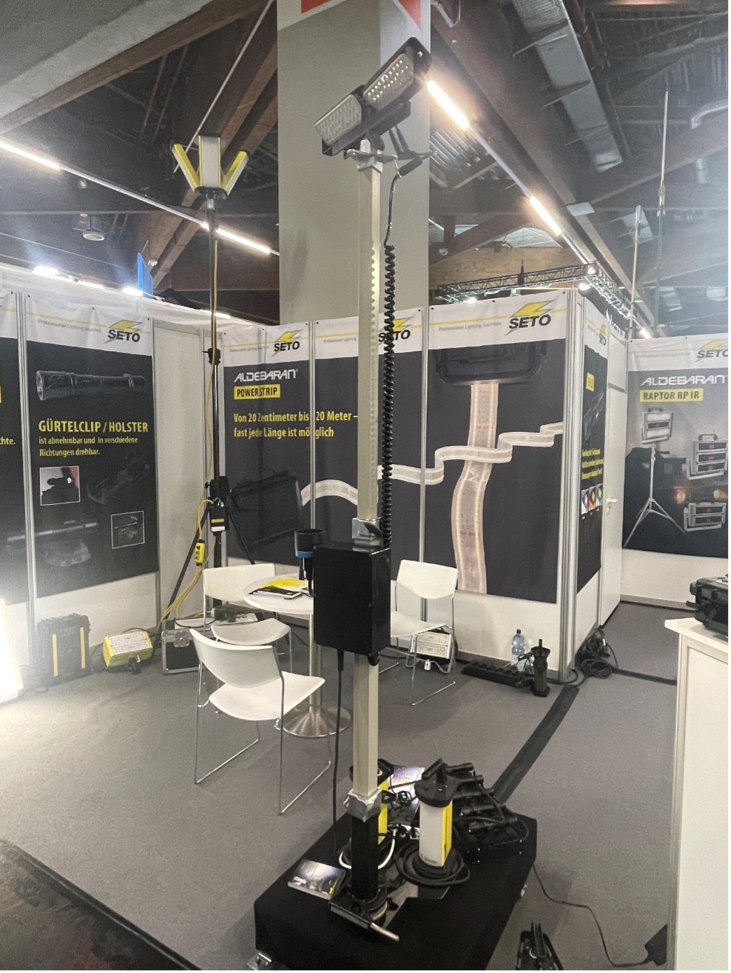 Ein Standard-Container in Kombination mit dem Mast von SETO ergibt eine Lichtpunkthöhe von bis zu 4,5 Metern. An der Spitze des Mastes sind auch Ösen für eine optionale Abspannung, sollte dies notwendig sein.