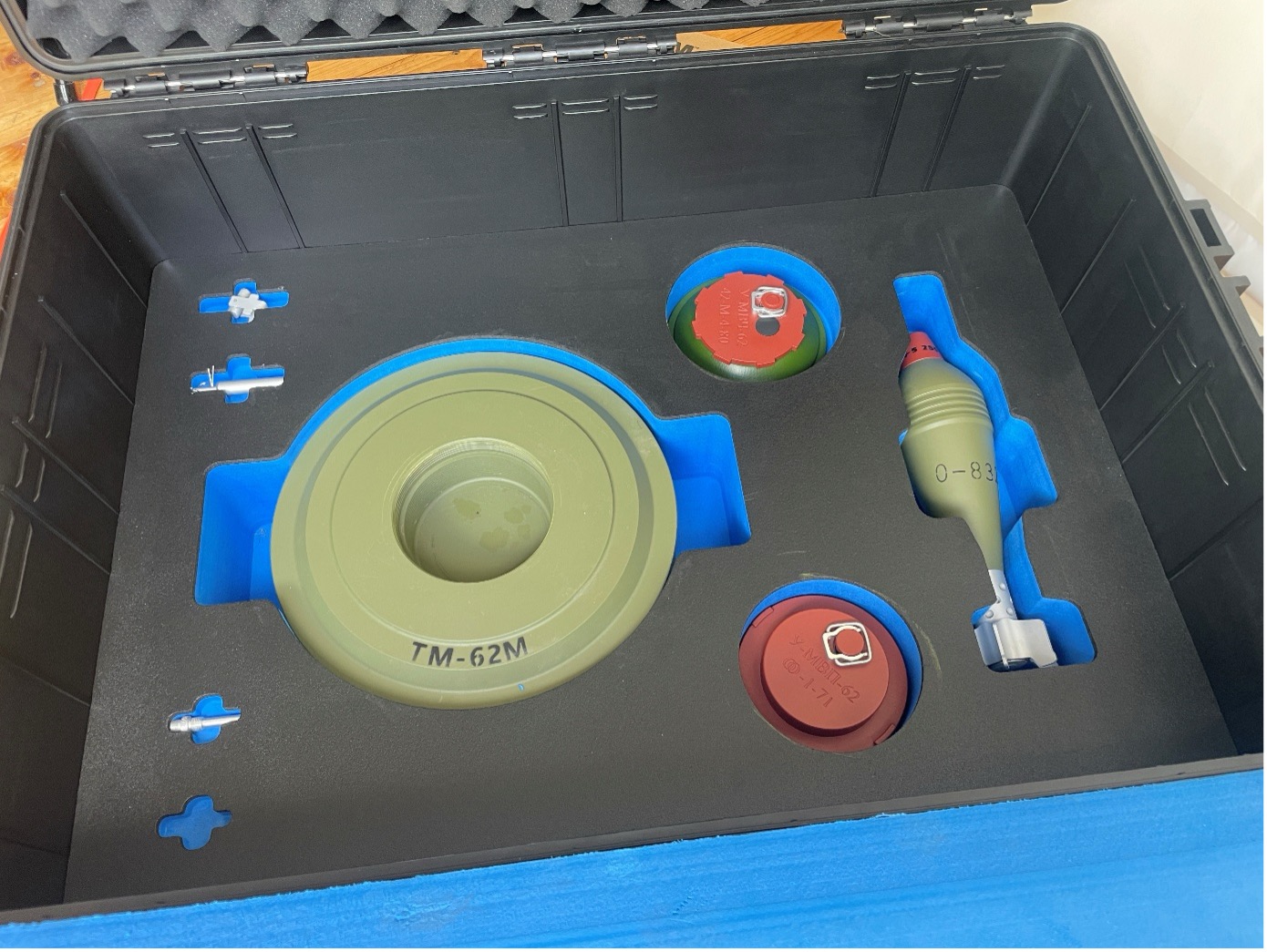 Sie bestehen aus strapazierfähigen, ungefährlichen Materialien, sehen authentisch aus und fühlen sich auch so an, ohne jedoch die mit echten Sprengstoffen verbundenen Risiken mit sich zu bringen. Sie sind universell anpassbar und wiederverwendbar und bieten optimale Trainingsunterstützung für EOD-Spezialisten, Sprengstoffdetektoren und die Vorbereitung von Sicherheits- und Militärpersonal. Das Kit umfasst unter anderem eine 152mm HE-OF-540 Artilleriegranate, eine 82 mm Mörsergranate, RPGs, MVP-62 Minenzünder, TM-62-M Panzerabwehrmine, RKG-3 und vieles mehr.