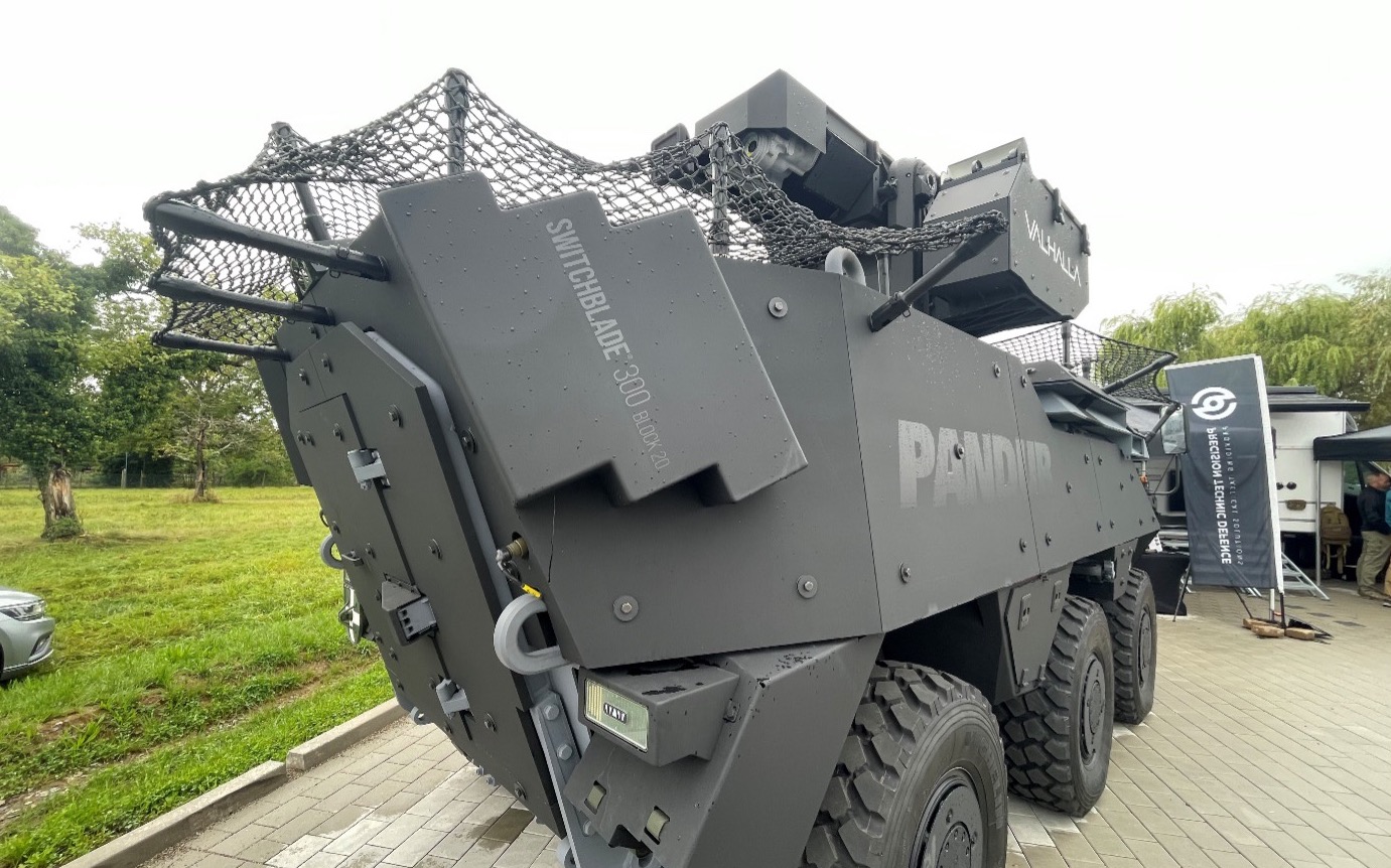 Neben der Hauptbewaffnung hatte das Fahrzeug auf dem KSK-Symposium am Heck jeweils seitlich drei Startkanister für die SWITCHBLADE 300 Block 20 angebracht. Diese Variante bietet eine Reichweite von bis zu 30 km, und eine Flugdauer von bis zu 20 Minuten. Auf dem Dach ist ein Netz als Schutz gegen FPV-Drohnen verbaut. Das selbe System wird bereits in der Ukraine seit längerem genutzt. Der Pandur bietet bis zu 11 Soldaten im Inneren Platz, und ist in dieser Konfiguration immer noch als Innenlast in einer Lockheed C-130 HERCULES verlastbar.