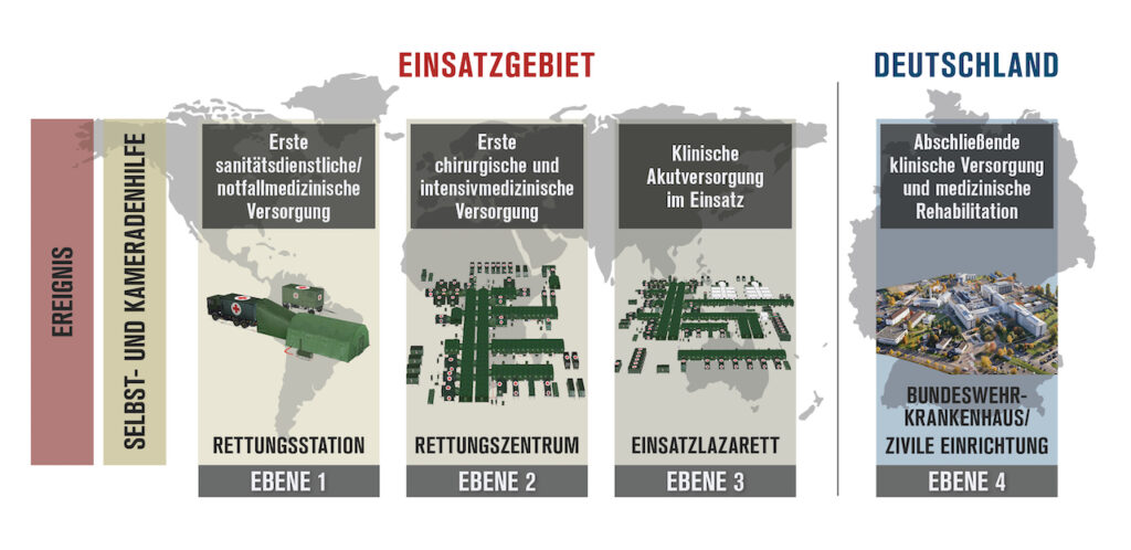 Sie umfasst neben der Selbst und Kameradenhilfe vor Ort vier Behandlungsebenen (sogenannte Roles bzw. NATO Roles) mit unterschiedlichem Leistungsspektrum: