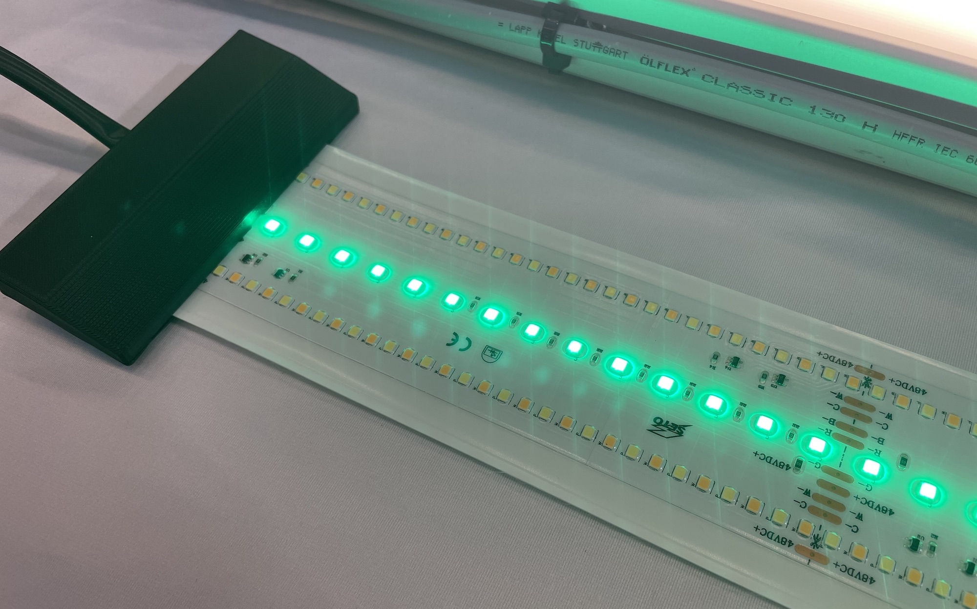 Der jetzt beim NATO CoE MilEng Industry Day gezeigte Beleuchtungsstreifen bietet LED-Reihen mit Farbwechseln in den Farben Rot, Grün und Blau. Zudem LED-Streifen in Weiß mit der Option zum Lichtmischen. Das heißt, das Licht kann auch in der Intensität/Helligkeit geregelt werden sowie zwischen Kalt- und Warmweiß. Der Nutzer kann die Lichtfarbe, -ausbeute und -wärme so frei nach seinen Anforderungen wählen und abändern.
