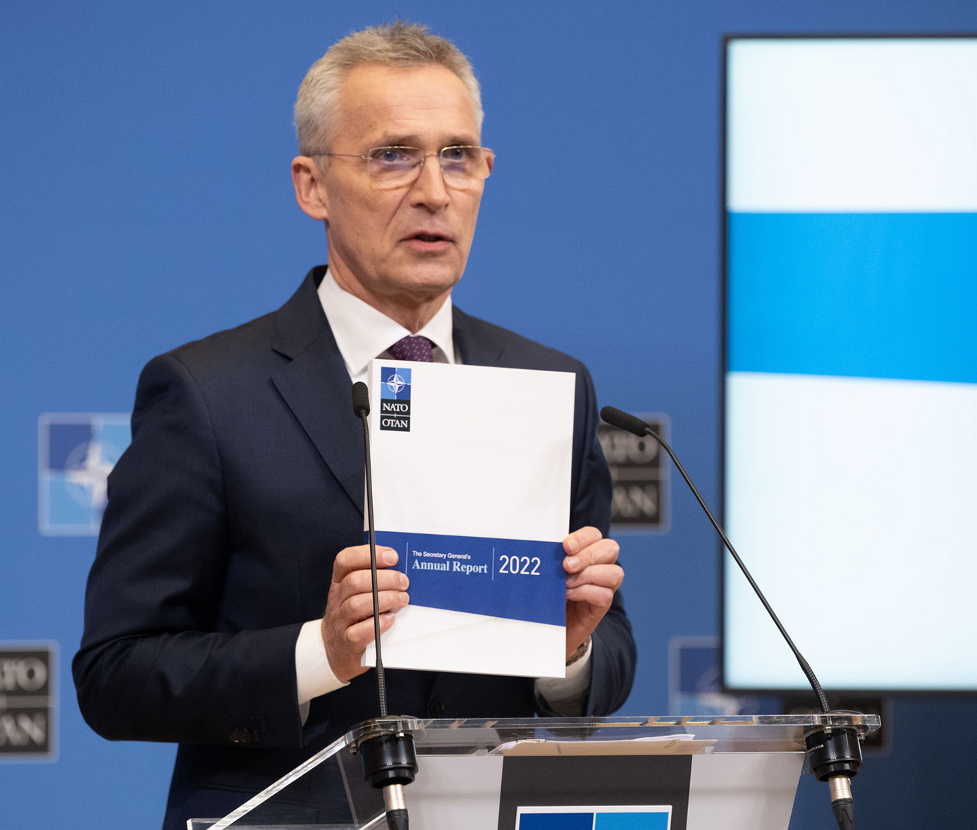 Vor dem Hintergrund des russischen Kriegs gegen die Ukraine im nunmehr zweiten Jahr fand Stoltenberg jedoch nicht nur kritische Worte für die Arbeit der NATO im Bündnis. Vielmehr lobte der Generalsektretär den „stählernen Widerstand des ukrainischen Volkes“ und die „beispiellose Unterstützung der NATO-Verbündeten für die Ukraine“. Er sagte, dass Präsident Putin „weniger NATO wollte, aber genau das Gegenteil bekommen hat: mehr NATO“. Dabei betonte Stoltenberg, dass der Beitritt von Finnland und Schweden die Allianz stärke und zeige, dass die Tür der NATO weiterhin offen sei.