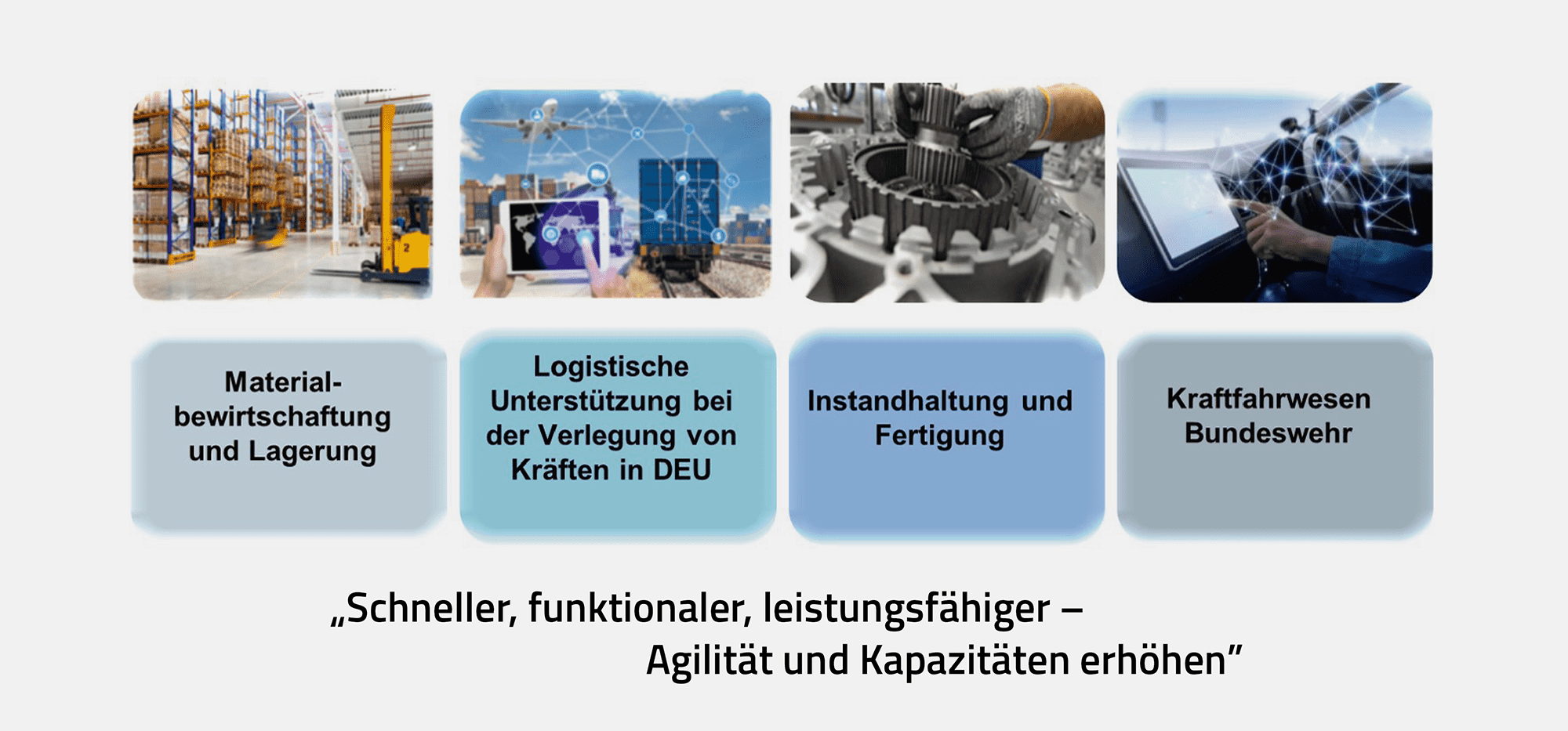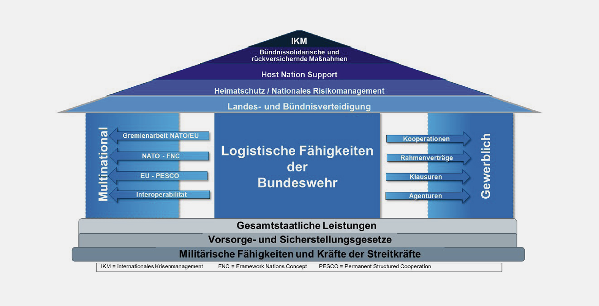 Zur Bewältigung dieser Herausforderungen galt und gilt es, die drei Säulen des LogSysBw zu stärken. Neben der noch engeren multinationalen Zusammenarbeit und der Erhöhung eigener militärischer Kapazitäten bildet die zielgerichtete Zusammenarbeit mit der Wirtschaft einen wesentlichen Bestandteil. Insbesondere, da militärische Kräfte begrenzt verfügbar und daher notwendige gewerbliche Leistungen zu integrieren sind, um die erforderlichen logistischen Leistungen erbringen zu können.