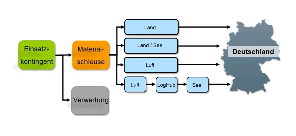 Der Ansatz einer Materialschleuse in Deutschland im Zuge der Operation Southern Cross des zweiten EinsKtgt United Nations Operation in Somalia II hat uns gelehrt, dass Transportkapazitäten für Material gebunden wurden, welches nicht für eine weitere Nutzung geeignet war. Dies verdeutlicht die wichtige Funktion der MatSchl LogDS i.E. im Hinblick auf Kategorisierung und Priorisierung.
