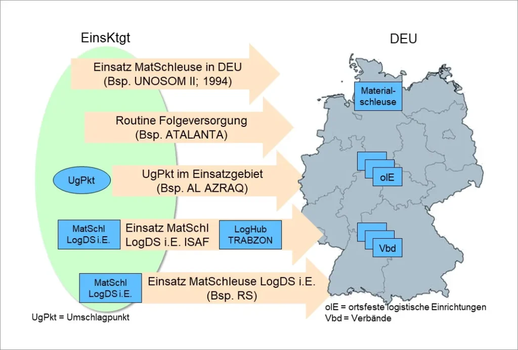 Die Einrichtung eines Umschlagpunkts in Trabzon (Türkei) im Rahmen der Kontingentanpassungen beim Übergang von der International Security Assistance Force (ISAF) zu RS und der damit verbundenen partiellen materiellen Rückverlegung ist ein weiteres Beispiel. In einem ersten Schritt erfolgte der Lufttransport nach Trabzon, von wo aus im zweiten Schritt der Seetransport durchgeführt wurde. Somit konnten die Kosten für den Lufttransport durch die deutlich kürzere Entfernung gesenkt und große Stückzahlen für den Seetransport zusammengefasst werden. Das eigentliche Ziel für die Einrichtung des Logistic Hubs (LogHubs) – die zerlegungsfreie Eingangsprüfung an den Nichtverbrauchsgütern (NVG) als Grundlage für die Einleitung der Instandsetzung – konnte nicht erreicht werden. Die Erfahrungen haben gezeigt, dass die Befundung durch eine zerlegungsfreie Eingangsprüfung den auftretenden Schadensbildern nicht gerecht wird und Schäden vielfach erst bei der Zerlegung im Zuge der Instandsetzung festgestellt werden können. Daher wurde dieser Ansatz bei der Rückverlegung RS nicht weiterverfolgt.