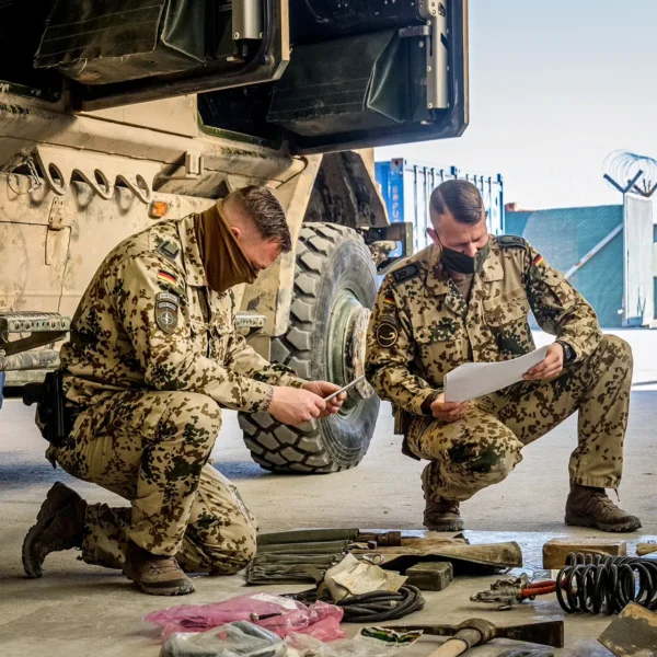 Foto 1: Soldaten prüfen im Camp Marmal in Mazar-e-Sharif/Afghanistan das Material vom Fahrzeug DINGO im Rahmen der Rückverlegung nach Deutschland nach der Mission Resolute Support.