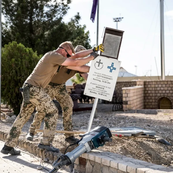 Foto 2: Soldaten entfernen das Eingangsschild von der Kirche im Camp Marmal in Mazar-e-Sharif/Afghanistan im Rahmen der Rückverlegung und Ende der Mission Resolute Support (RSM).