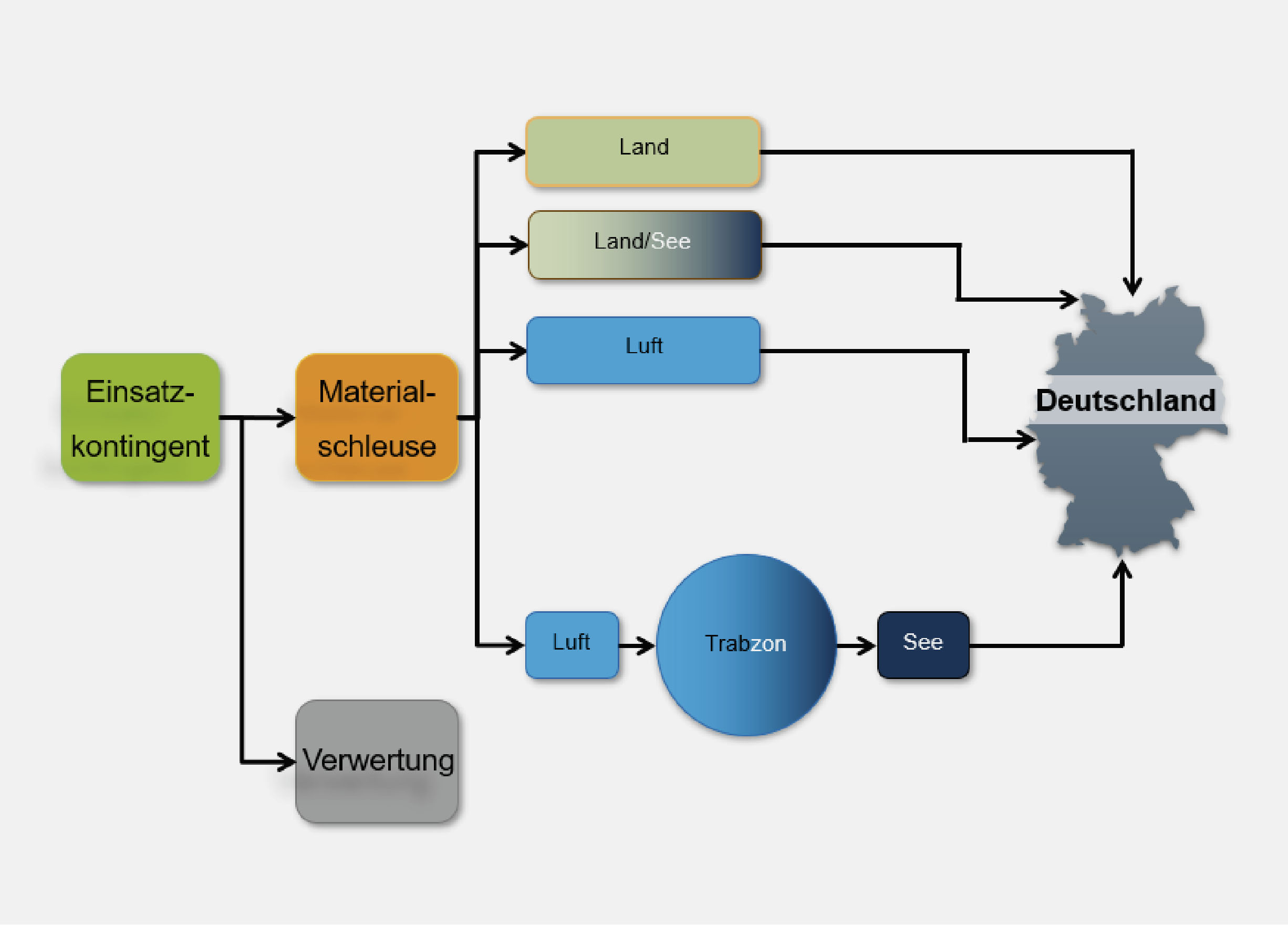 Die Einrichtung eines Umschlagpunkts in Trabzon (Türkei) im Rahmen der Kontingentanpassungen beim Übergang von der International Security Assistance Force (ISAF) zu RS und der damit verbundenen partiellen materiellen Rückverlegung ist ein weiteres Beispiel. In einem ersten Schritt ist der Lufttransport nach Trabzon erfolgt, von wo aus im zweiten Schritt der Seetransport nach Deutschland durchgeführt worden ist. Somit konnten die Kosten für den Lufttransport durch die deutlich kürzere Entfernung gesenkt und große Stückzahlen für den Seetransport zusammengefasst werden. Das eigentliche Ziel für die Einrichtung des Umschlagpunkts – die zerlegungsfreie Eingangsprüfung an den Nichtverbrauchsgütern (NVG) als Grundlage für die Einleitung der Instandsetzung – konnte hingegen nicht erreicht werden. Die Erfahrungen haben gezeigt, dass die Befundung durch eine zerlegungsfreie Eingangsprüfung den auftretenden Schadensbildern nicht gerecht wird und Schäden vielfach erst bei der Zerlegung im Zuge der Instandsetzung festgestellt werden können. Daher ist dieser Ansatz bei der Rückverlegung RS nicht weiterverfolgt worden.