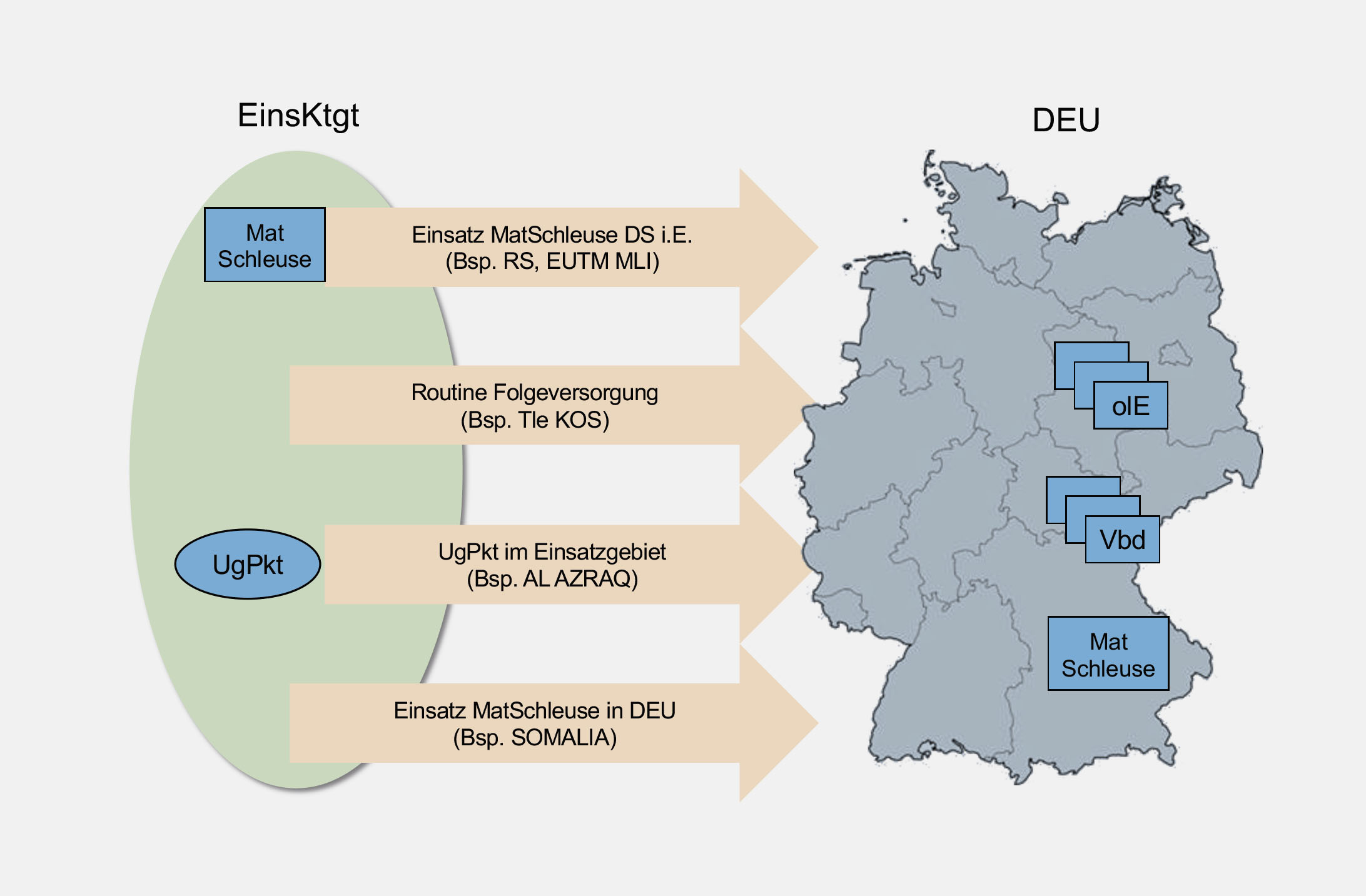 Anfang der 90er Jahre wurde im Zuge der Operation Southern Cross des 2. EinsKtgt United Nations Operation in Somalia II noch der Ansatz einer Materialschleuse in Deutschland verfolgt. Damals wurden aufgrund dieses Konzeptes Transportkapazitäten für Material gebunden, welches nicht mehr für eine weitere Nutzung geeignet war. Dass wir aus dieser Erfahrung heraus heute die MatSchlLogDS i. E. im Einsatzgebiet einrichten, verdeutlicht, wie im Laufe der Jahre Erfahrungswerte in bestehende Verfahren umgesetzt wurden. Heute nimmt die MatSchlLogDS i. E. im Hinblick auf Kategorisierung und Priorisierung eine entscheidende Funktion wahr.