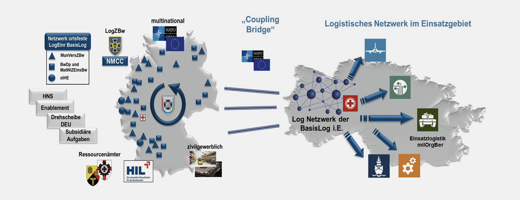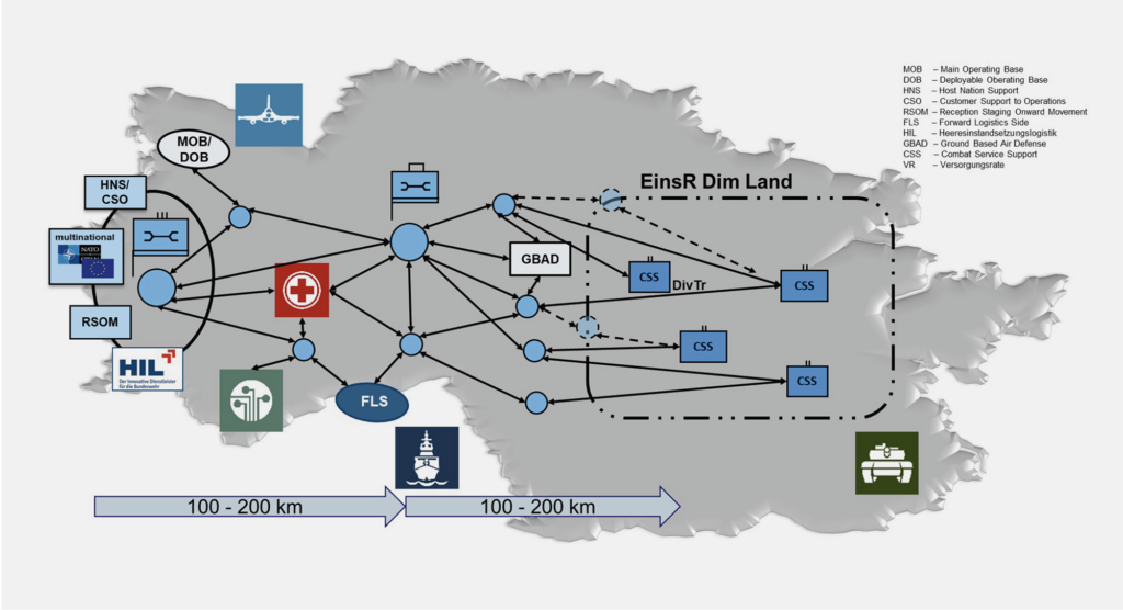 Die Versorgungs- und Leistungswege im Inland und im Einsatzgebiet werden dabei nach dem Prinzip einer belastbaren und durchgängigen Kette verknüpft, die unter Einbeziehung militärischer und ziviler Einrichtungen/Leistungserbringer und durch Nutzung verfügbarer, zweckmäßiger Verkehrsinfrastruktur die logistische Basis Inland und das logistische Netzwerk im Einsatzgebiet funktional verbinden.