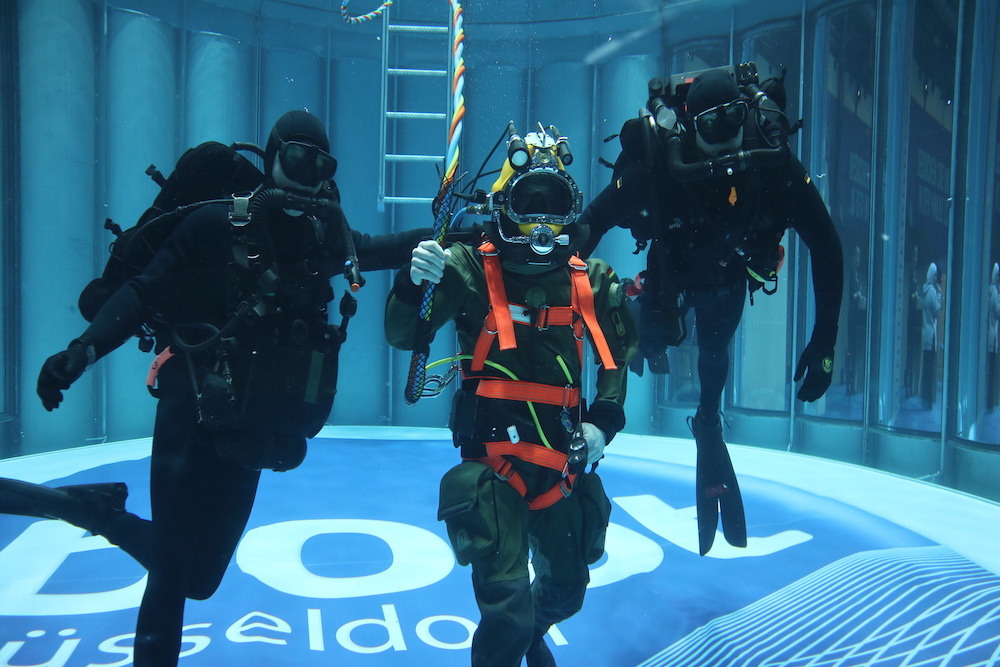 Bei der Messe boot wird mit Helm getaucht