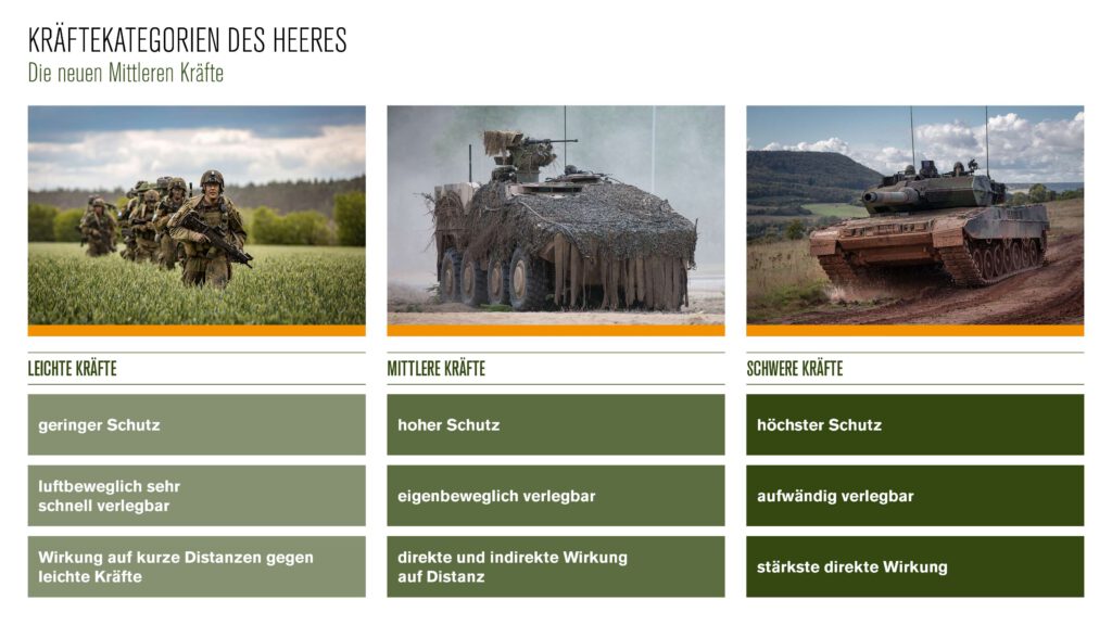 Jede dieser Kräftekategorien hat dabei Vorteile – aber auch Nachteile. Feuerkraft und Beweglichkeit im Gelände ist bei den Schweren Kräften sehr hoch, für strategische Verlegungen benötigen sie allerdings erhebliche Transportkapazitäten und Bewegungen und erfordern eine umfassende Planung von Kräften, Zeit und Mitteln. Aufgrund ihrer Panzerung verfügen sie über ein sehr gutes Schutzniveau. Mittlere Kräfte (die ausschließlich radgebunden sein werden) haben demgegenüber nur eine moderate Geländegängigkeit. Bewegungen sind überwiegend an das Straßen- und Wegenetz anzulehnen. Allerdings sind sie im Gegensatz zu Schweren Kräften eigenbeweglich und eignen sich insbesondere für längere Verlegungen – zum Beispiel beim Kfz-Marsch in ein zukünftiges Einsatzgebiet. Sie verfügen im Vergleich zu den Schweren Kräften über eine reduzierte Durchsetzungsfähigkeit. Mit Blick auf den Auftrag und das zu erwartende Gelände verfügen die geplanten neuen Waffensysteme über eine angemessene Feuerkraft und ein gutes Schutzniveau.