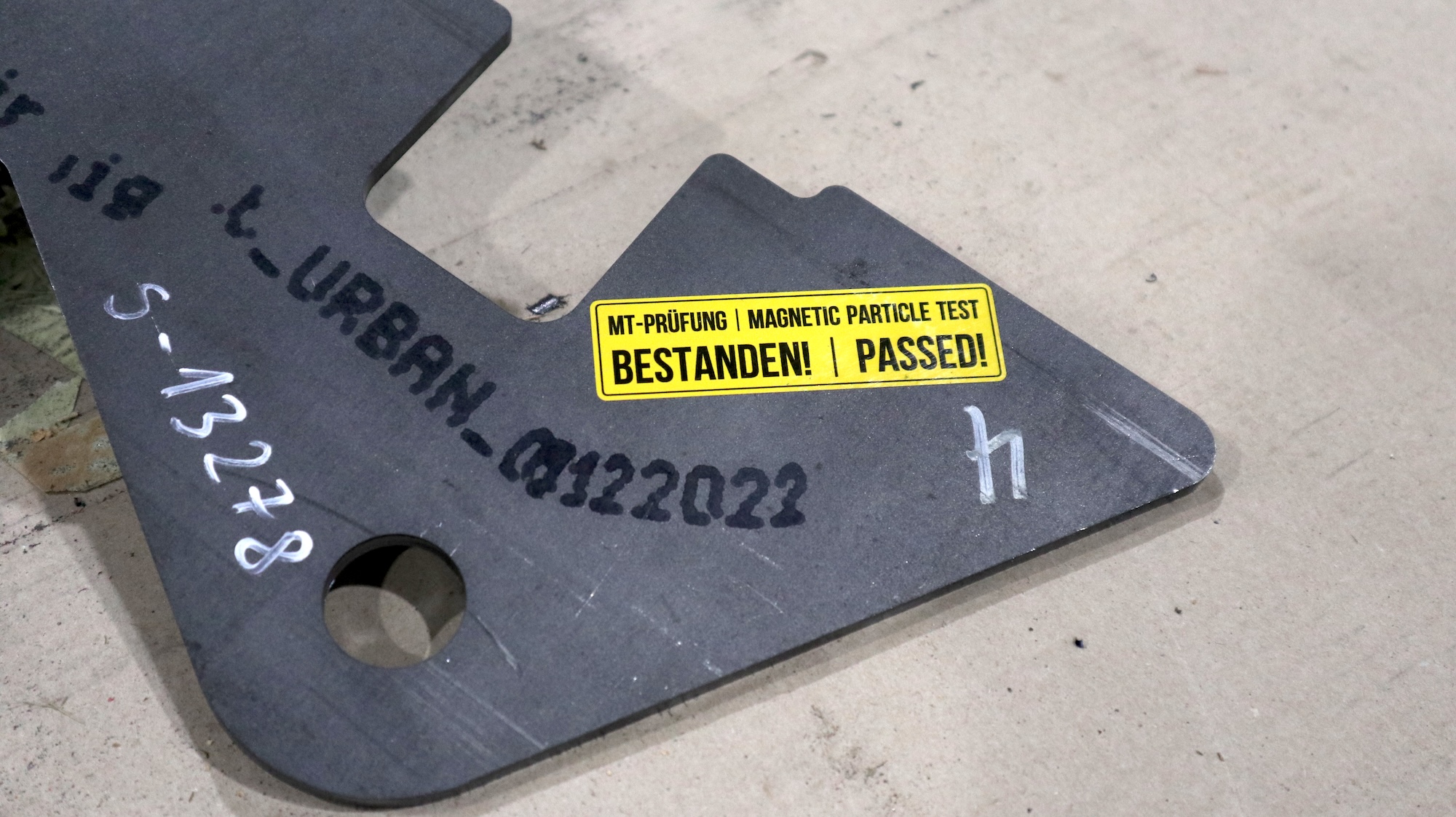 Bei Urban Industries kontrolliert ein Materialprüfer im abgedunkelten Raum jedes Stück. Eine fluoreszierende Flüssigkeit enthält Metallspäne, ein Elektromagnet bewegt sie. Treffen die Späne auf einen winzigen Riss, wird dieser dort unter Speziallicht für das menschliche Auge sichtbar. Mit etwas Glück lässt sich der Oberflächenriss schleifen. Wenn nicht, wird das Blech aussortiert.