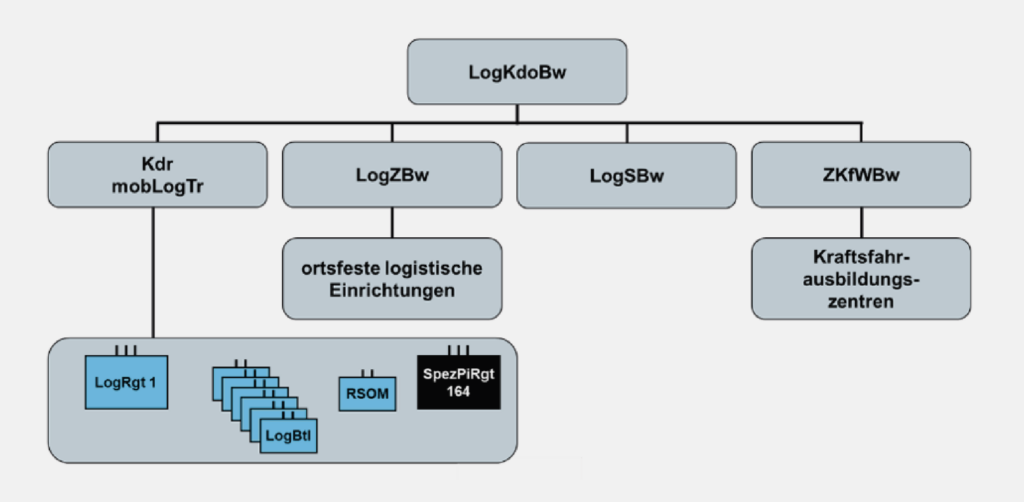 Neben dem Kommandostab in Erfurt bilden die mobilen Logistiktruppen Streitkräftebasis (mobLogTr SKB), das Logistikzentrum der Bundeswehr (LogZBw), die Logistikschule der Bundeswehr (LogSBw) und das Zentrum für Kraftfahrtwesen der Bundeswehr (ZKfWBw) die „vier Pfeiler des LogKdoBw“ und damit die Grundlage, um die umfangreichen Aufgaben erfüllen zu können (zugeordnete Fachaufgabe).