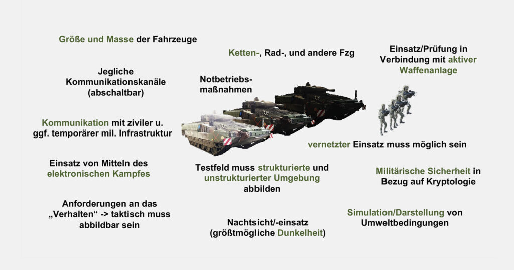 Die bisherigen Herausforderungen zur Erteilung einer Betriebserlaubnis/Zulassung lassen sich grundsätzlich in zwei Bereiche gliedern. Erstens die mechanische/elektrische Ausgestaltung der Fahrzeugtechnologie und zweitens, die Qualifikation des Bedieners. Mit der Einführung von technischen Systemen zur Umwelterkennung, eigenständiger Steuerungsunterstützung und Steuerung, sind dementsprechend neue Betrachtungen zur Verifikation der Funktion und der Vergleichbarkeit zur bisherigen Sicherheit anzustellen. Software und Elektronik übernimmt Aufgaben, die bisher durch den Bediener wahrgenommen wurden. Aber reagiert die Technik in unterschiedlichen Situationen wie erwartet? Ermöglicht die Technik dem Bediener, das Fahrzeug sicher zu führen und den militärischen Auftrag zu erfüllen?